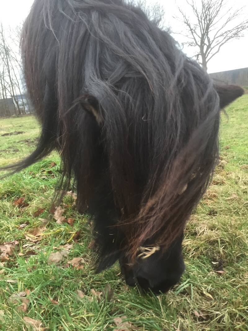 Eva is geboren in een natuurgebied. In haar hele leven heeft ze eigenlijk vooral pony kunnen zijn. Ze is niet beleerd, nooit bereden. Ze is vooral pony. Wel is ze gevoelig voor dik worden en bij teveel gaat ze stram lopen, of liever loopt ze niet. We proberen haar zoveel mogelijk te helpen en juist te motiveren om wel te bewegen. Chico probeert dat met ons mee.